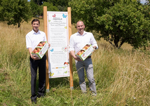 Alfred Probst (Direktor Zentraleinkauf Frische, REWE International AG) und David Eibel (Geschäftsführer, OPST Obst Partner Steiermark GmbH) präsentieren gemeinsam die ersten aufgestellten Informationstafeln der Initiative „Blühendes Österreich" auf den Ökowertflächen der frisch-saftig-steirisch Apfelproduzenten.