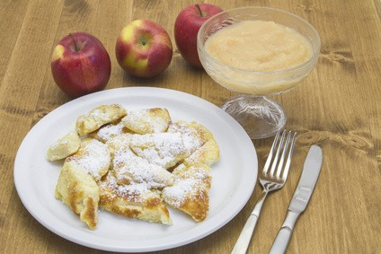 Schluß vorsichtig den Eischnee untermengen. Die Masse über die Apfelwürfel